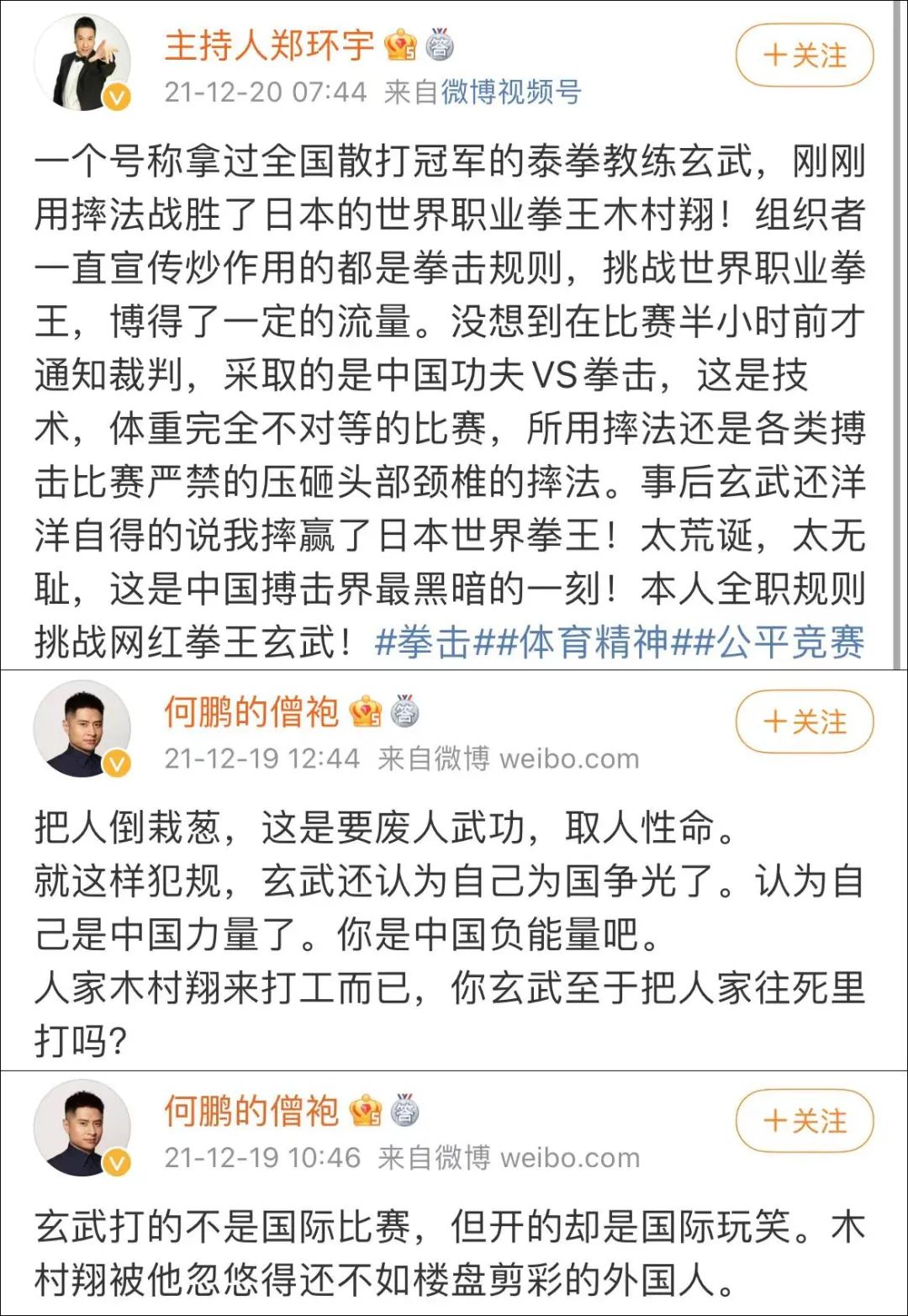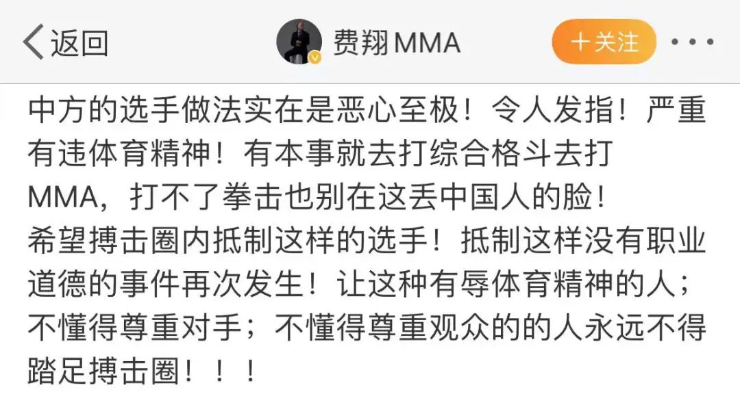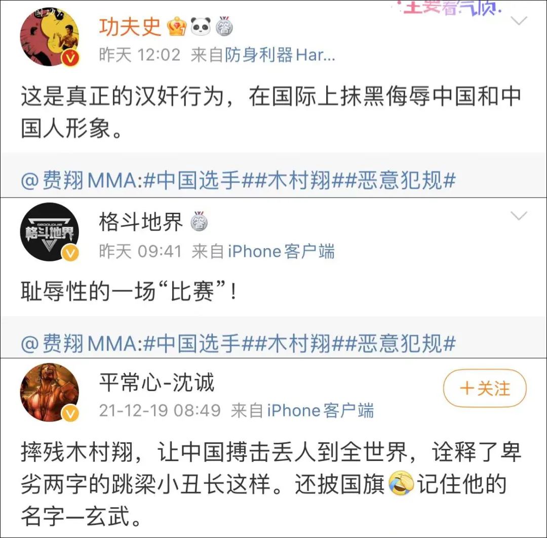 知名搏击赛事资讯媒体也都纷纷发声,@功夫史 言辞严厉,“这是真正的汉奸行为,在国际上抹黑侮辱中国和中国人形象。”搏击媒体人@平常心-沈诚 说,“摔残木村翔让中国搏击丢人到全世界,诠释了卑劣两字的跳梁小丑长这样。”