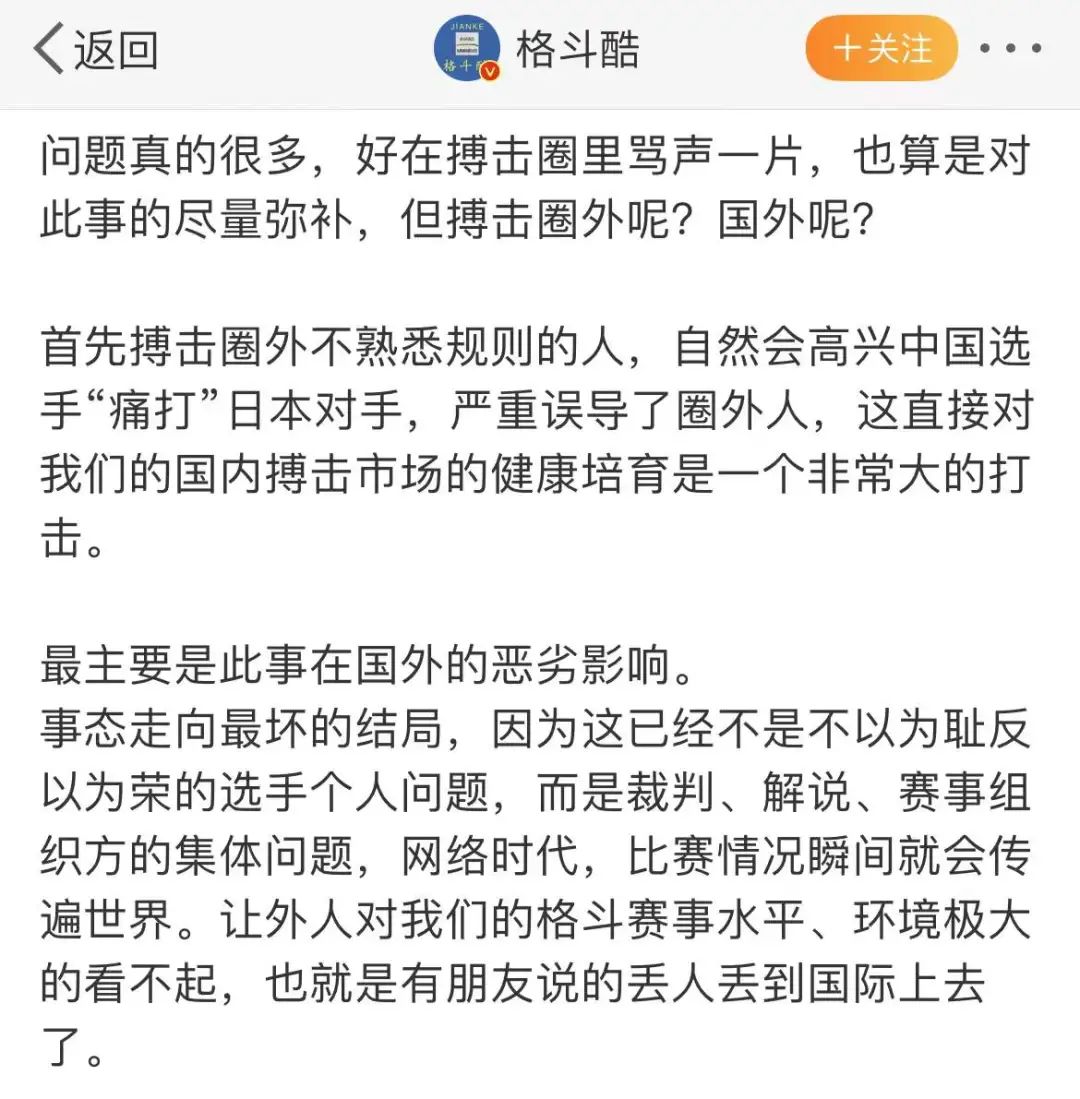@格斗酷 感叹对于搏击圈外不熟悉规则的人,自然会高兴中国选手“痛打”日本对手。这严重误导了圈外人,直接破坏了国内搏击市场的健康培育,更是在国外也引起了恶劣影响,让外人对中国的格斗赛事水平、环境极大地看不起,“也就是有朋友说的丢人丢到国际上去了”。