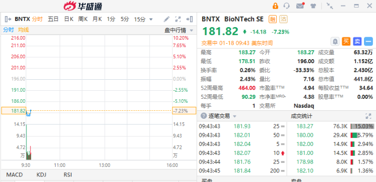 华盛资讯1月18日消息,美股盘初,美股抗疫概念股齐挫。截至发稿,BioNTech SE(BNTX)跌超7%,诺瓦瓦克斯(NVAX)跌超4%。