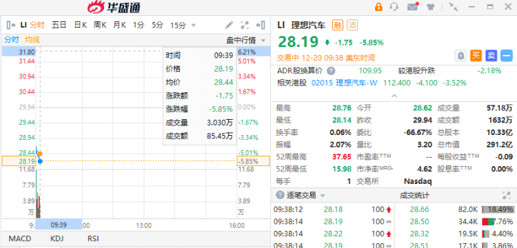 华盛资讯12月20日消息,新能源汽车板块全线下挫。截至发稿,理想汽车(Li)跌近6%。