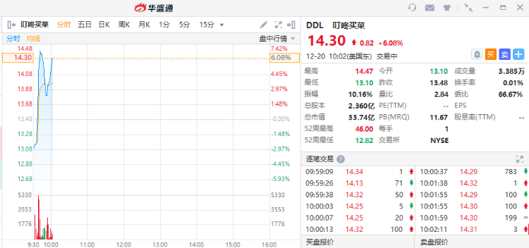 叮咚买菜(DDL)逆市上涨,截至发稿,该股涨超6%,现报14.3美元。此前据悉公司拟回购至多3000万美元股票。