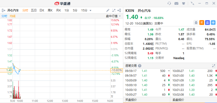 华盛资讯12月20日消息,美股早盘热门中概股普跌,开心汽车(KXIN)跌超10%。