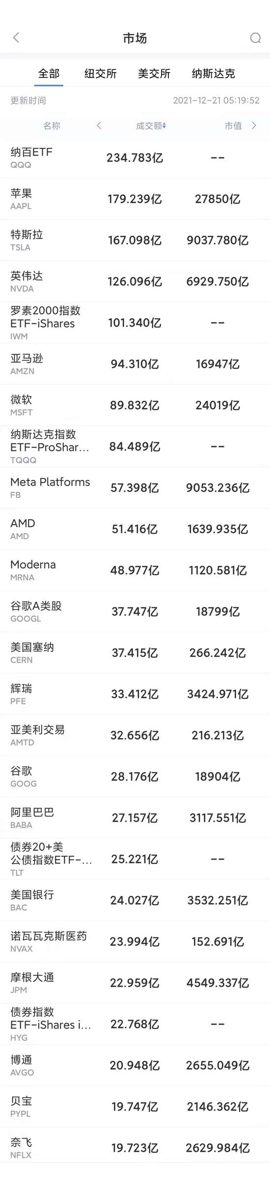 以下为美股当日交易最活跃的20只股票(按成交额):