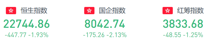 港股周一恒指跌1.93%,报22744.86点,国企指数跌2.13%,红筹指数跌1.25%。恒生科技指数跌超3%,续创历史新低,比亚迪电子跌超6%,网易跌近5%,京东跌4%,快手跌4.05%。