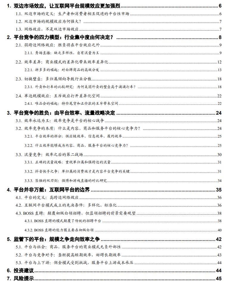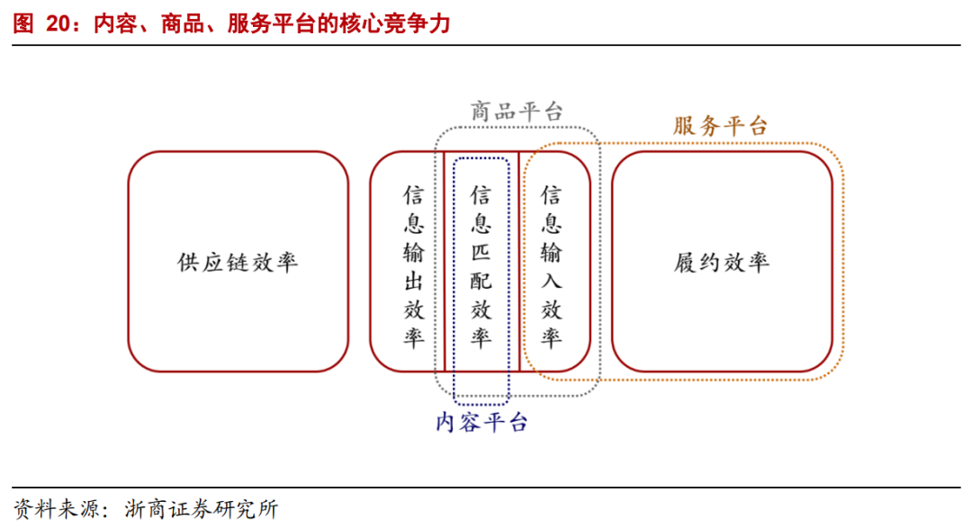 ■ 平台效率和流量战略决定了平台的此消彼长 我们认为,效率之争是一切平台竞争的根本,而在效率趋同的情况下,流量之争则是核心。内容平台的核心竞争力是信息匹配效率,商品平台的核心竞争力是信息匹配效率和信息输入效率,服务平台的核心竞争力是信息输入效率和履约效率。