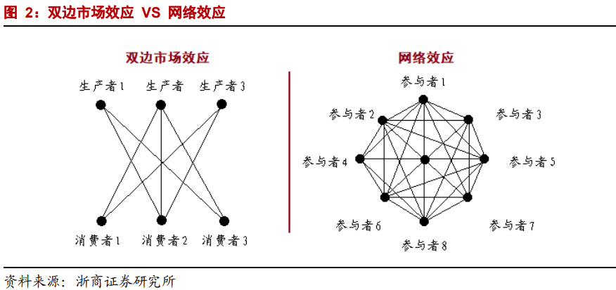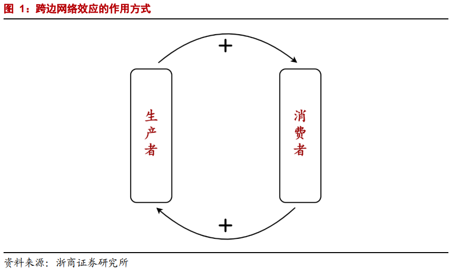 第二,具备跨边网络效应:即每边的参与者数量的提升,可提升另一边参与者的效用或收益。在多数生产者和消费者组成的双边市场,生产者的增加可以提高消费者的选择丰富度,从而提高消费者的效用。而消费者的增加可以增加生产者的销量,提升生产者的收益。