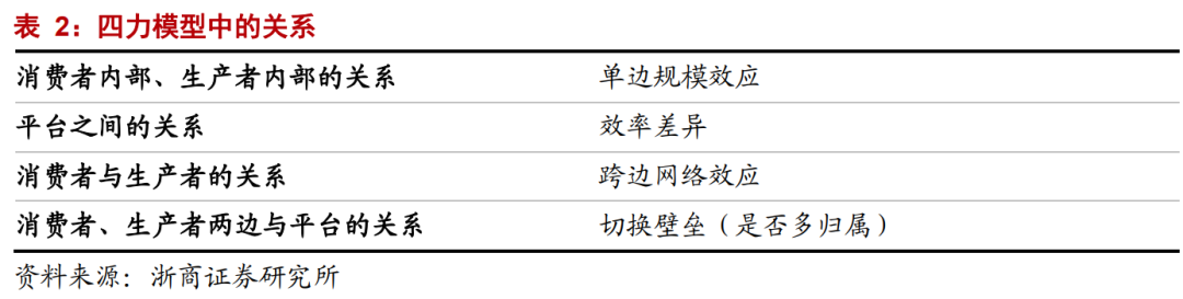 我们认为,平台的竞争格局由以下四个因素决定(“+”表明促进集中度提高,“-”相反)