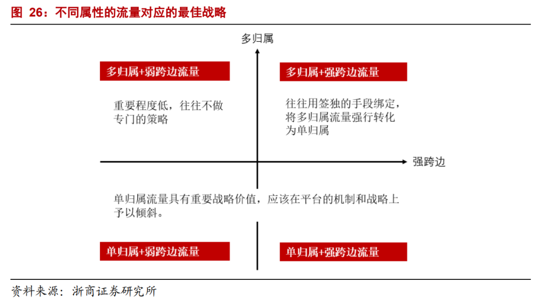 根据归属倾向和跨边网络效应两个维度,我们将流量分为四个象限。对于不同属性的流量,有着不同的最佳战略。