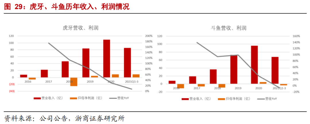 但这一模式过于容易模仿,行业内迅速出现多家游戏直播公司。平台之间的混战使得游戏主播价格快速提高,在2017年左右,行业头部主播普遍达到2000万元/年的价格。我们可以看到,在2018年及之前,行业头部游戏直播公司都无法获得显著的盈利,即使是成功上市的斗鱼、虎牙也都是亏损或者持平。这主要是因为游戏直播的内容非常重度,耗费大量时长,且不同主播之间内容质量参差不齐,这导致了很多用户在选定喜爱的主播后,就一直看同一个主播的内容,不会与平台其它主播发生互动。这种低连带率,使得头部主播对平台议价能力非常强,吞噬了平台的利润。
