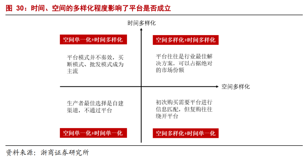 时间单一化+空间单一化:这意味着行业往往被少数公司垄断。这一类公司最佳选择是建立品牌,不经过平台,自建渠道,完成利益的最大化。譬如高端白酒,就非常不依赖线上线下的平台进行出售。