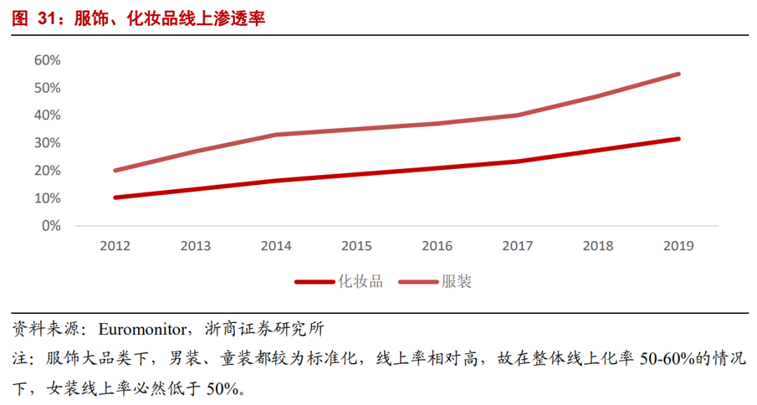 对于其中不太标准化的行业,互联网平台往往与线下平台共存。如商品中的女装、彩妆,虽然电商已经高度发达,但线下销售率一直在50%以上。同时我们看到,线下销售渠道主要也是大卖场、商业地产一类的平台性组织。这是因为女装、彩妆SKU众多,平台模式效率高。但同时又极度非标,线下体验对消费决策的准确率帮助较大。另外,对于这一类行业,缓解信息不对称是未来的演进方向,如直播电商,通过直播这一新的载体缓解了信息的不对称,就迎来了爆发式增长。