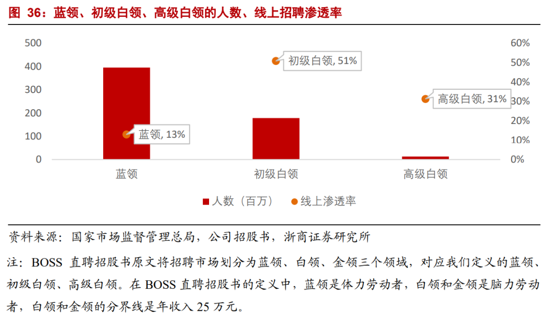 但是我们同时发现,BOSS直聘的能力圈主要在初级白领,而在高级白领、蓝领领域渗透率都较为有限。我们认为,这是因为高级白领过于非标,而蓝领则过于单一,平台模式的效率都比较有限。