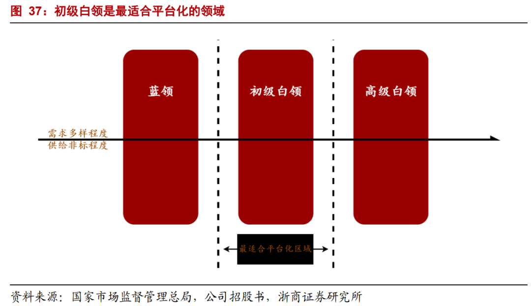 如下图所示,我们认为,从蓝领到初级白领、再到高级白领,技能复杂度依次提高,供给的标准化在依次降低,需求的多样化则在依次提高。而满足供给相对标准化,需求相对多样化的领域只有初级白领,则成为了平台模式效率最高的领域。