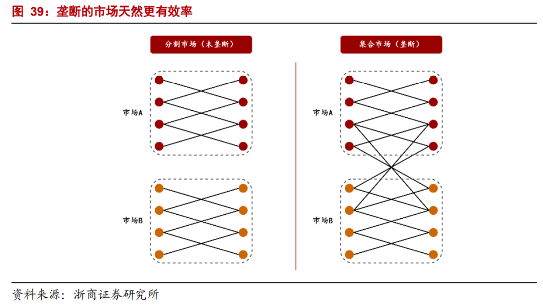 商品、服务平台都属于有自然垄断属性的行业,短期而言,垄断才能实现效率的最大化。这是因为,在双边市场下,只有在双边的用户量最大的情况下,才能产生最大的跨边网络效应。用另一个方式说,则是集合的市场比分割的市场更具有效率。