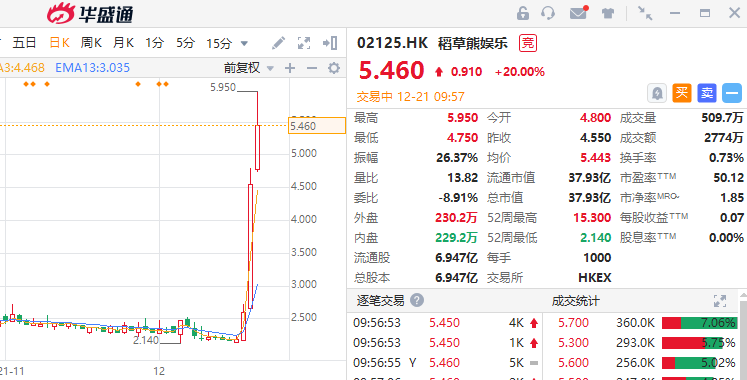 华盛资讯12月21日消息,稻草熊娱乐持续走高,现涨超20%,最新市值38亿港元。该股昨日收涨超70%,两日实现股价翻倍。