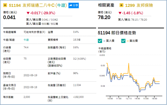 2、看错方向:友邦瑞通二八牛(51194.HK),周一下跌29.3%。