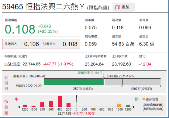 1、强势轮证:恒指法兴二六熊(59465.HK),周一大涨83.05%;