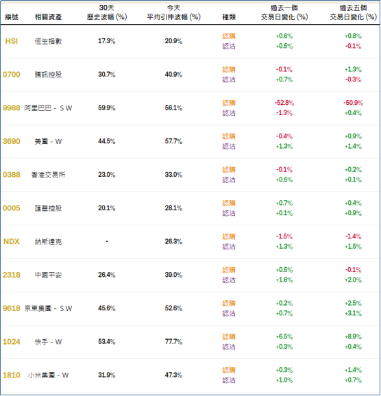 周一恒指相关权证的平均引伸波幅报约20.9%,按日微幅上升。个股方面,阿里相关认购证的引伸波幅大幅下调,达约52.8%。