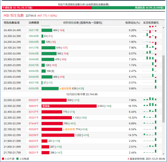 街货分布方面,至周一,恒指牛证街货主要在收回价22200点至22700点之间,累计相当约5689张期指合约;恒指熊证街货在收回价23400点至23900点之间,累计相当约1360张期指合约。