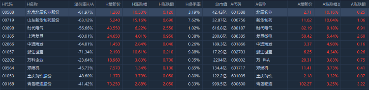 截至发稿,午后北辰实业A股强势涨停,H股亦大幅拉升,涨10.53%;新华制药AH股齐拉升,A股涨停,H股涨超15%。