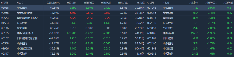 中铝国际A股跌停,H股跌13.50%;庄园牧场A股跌2.17%,H股大跌12.28%