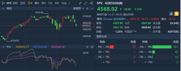 隔夜美国股市下跌,其中标普500指数 $SPX 下跌1.14%,收于4568.02点。Omicron疫情加剧、拜登支出法案遇阻引发了投资者对经济复苏的担忧,高盛 $GS 在美国民主党参议员曼钦(Joe Manchin)表态不支持总统拜登(Joe Biden)的“Build Back Better”支出法案后,把对美国2022年前三个季度的经济增长预期分别从3%、3.5%、3%下修为2%、3%、2.75%。这可能是隔夜美股下跌的主要原因。