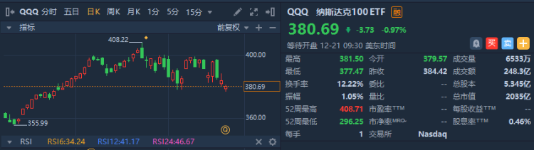 纳斯达克100 ETF: 该分析师认为,QQQ上周跌破383点,使得近期的趋势偏向看空。在年底价格开启反弹之前,QQQ有可能继续下滑至371点。周一,QQQ收于380.69点,本月迄今累计下跌3.3%,年度迄今累计上涨21.3%。