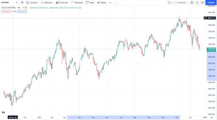 FANG+ 尖牙股指数(NYFANG):该分析师认为,该指数从2021年春季低点起始的温和上升趋势现正接近定调涨跌的关键时刻。