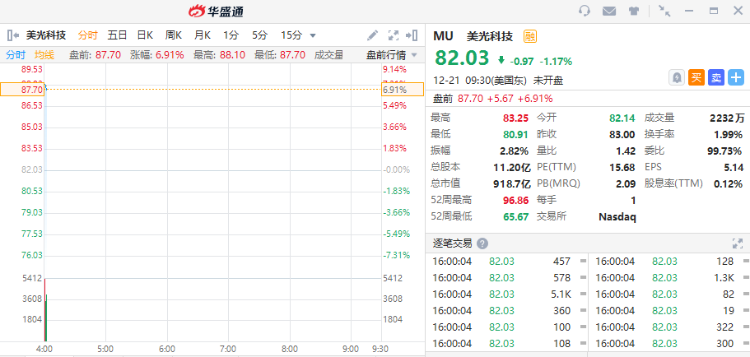 华盛资讯12月21日消息,今日美股盘前,美光科技(MU)盘前续涨6.91%,隔夜盘后大涨6%;Q1业绩超预期,营收同比增长33%,净利润同比增长超180%。