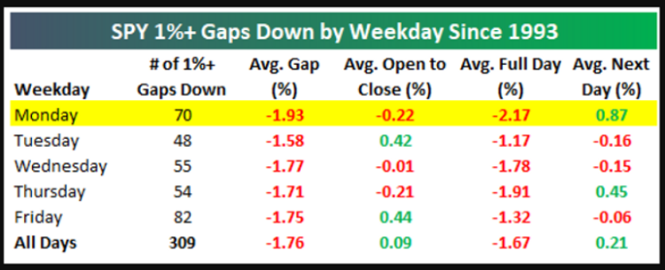 以比较主流的大盘投资标的标普500指数ETF-SPDR $SPY 为计算对象,当周一的跌幅达到1%以上时,其在紧接而来周二的平均涨幅达到了约0.87%。据几名研究员所说,自1993年该ETF创立以来,其总共309次录得1%以上的单日跌幅,而0.87%这个数字正是基于这309个交易日的数据得出的。