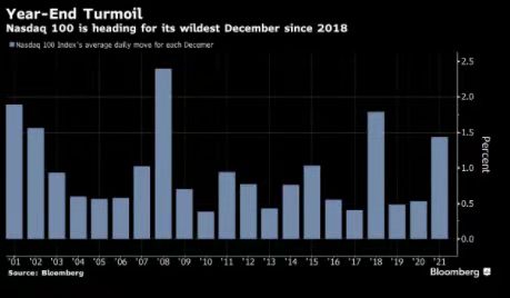 美国科技股12月波动不止,将被视为此轮牛市标记的平稳表现置于风险之中。纳斯达克100指数本月以来每天的收盘对收盘绝对波动幅度约为1.4%。这是自2018年圣诞节以来,任何一个12月波动度的三倍。除了走势波动之外,这个以科技股为焦点的指标在过去三周内,已经出现五次单日至少2%的波动,其中三次上涨、两次下跌,打平过去五个月中可比的疯狂交易日数。