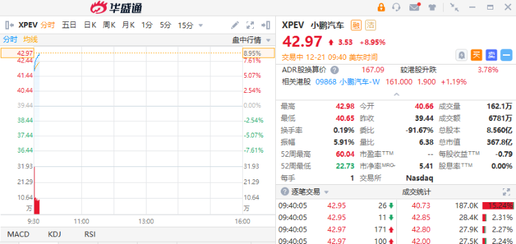 华盛资讯12月21日讯,美股早盘,美股新能源车板块集体拉升,小鹏汽车(XPEV)一度涨近9%,截至发稿,该股涨7.51%,现报42.39美元。