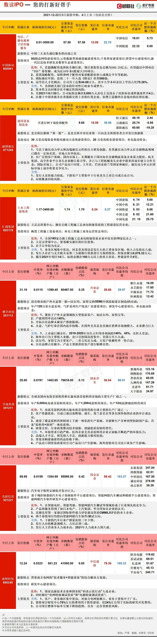 今日有4只新股上市,分别是:创业板的雅艺科技、亨迪药业、光庭信息,科创板的南网科技。另有3只新股申购,分别是:沪市主板的中国移动、汇通集团以及北交所的威博液压。