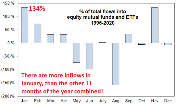 一是,今年全球股市流入的资金规模超过过去25年的总和。第二点,也是更重要的理由是,1月通常是大多数基金配置资金的时间。1996年到2020年这24年间,历年1月的流入资金约占资金流总规模的134%,预计明年1月就会有超过1250亿美元的资金流入股市。