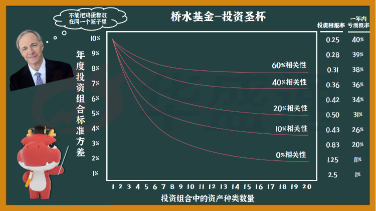 达利欧指出,如果有接近10个左右的良好的、互不相关的回报流,就可以大大降低投资组合的风险,但同时又不减少预期收益。