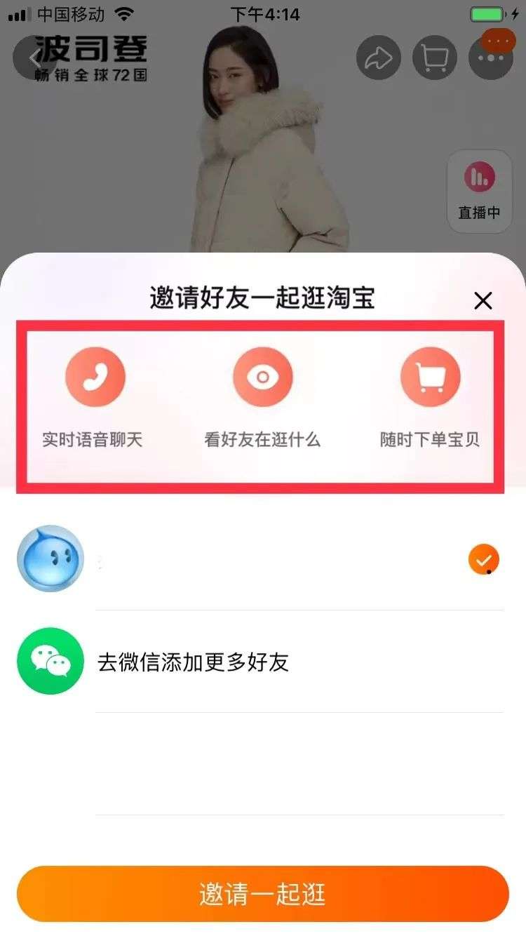 12月2日,淘宝正式上线“一起逛”功能,在商品详情页的右上角菜单,用户邀请好友并获得对方同意后,会以悬浮窗展示对方正在查看的商品,点击就可以浏览商品详情,一边语音聊天一边挑选商品。