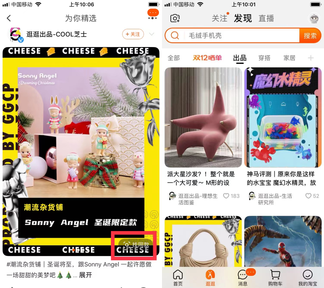 从首页淘宝逛逛入口可以看到,除了穿搭、家居、彩妆、美食、萌宠等标签之外,还有一个“出品”标签,由逛逛出品为主题的各种子矩阵账号组成,涵盖生活用品、电影等各个方面。用户只需点击右下角的“找同款”,便可以一键关联到淘宝内海量同款产品,进行消费决策。