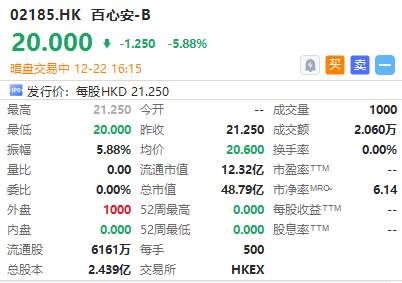 华盛资讯12月22日讯,介入医械企业百心安-B $02185.HK 暗盘现跌5.88%,最新总市值超48亿港元。该股预计将于明日(12.23)正式挂牌上市。