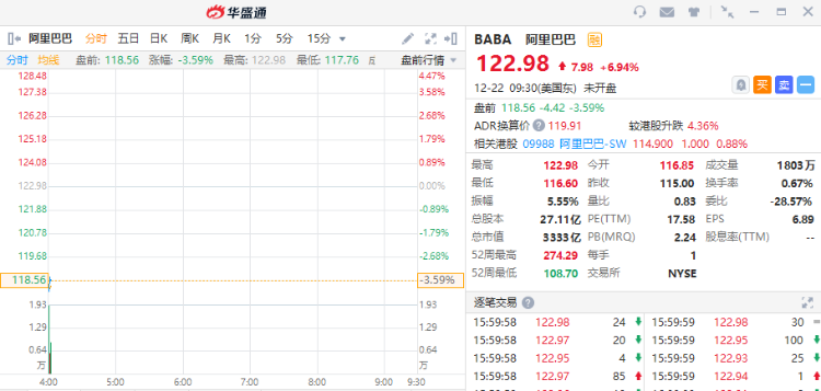 华盛资讯12月22日消息,今日美股盘前,阿里巴巴(BABA)盘前跌3.59%,此前阿里云被暂停作为工信部网络安全威胁信息共享平台合作单位。