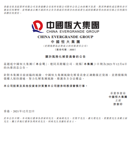 12月22日消息,中国恒大港交所公告,针对本集团目前面临的风险,中国恒大集团风险化解委员会正调动广泛资源,并将积极与债权人保持沟通,努力化解集团风险,维护各方合法权益。
