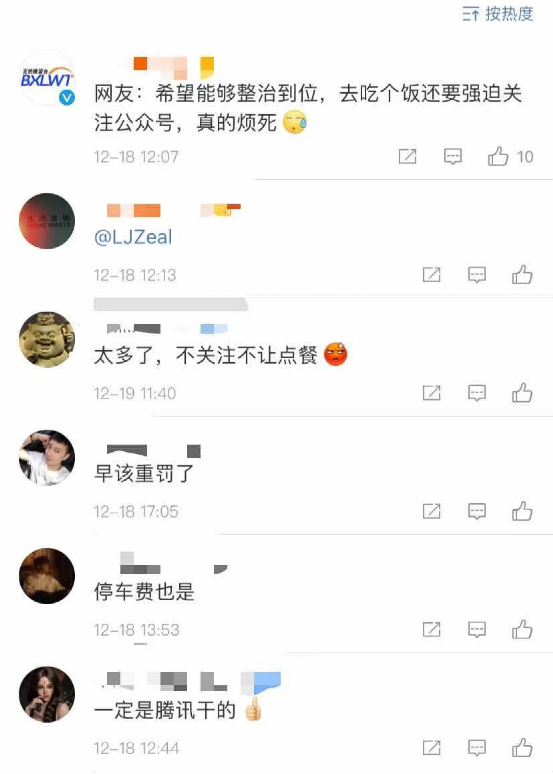 网上关于这种强制关注公众号的乱象讨论早有耳闻,只不过是受制于微信扫码点餐的使用频次较高,网友及消费者对之的愤恨、不平呼声较高。但真正操作这种“必选项”催熟的背后,却是商家和微信的利益收割。
