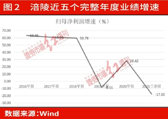 而且,在过去历次提价过程中,涪陵榨菜的业绩都是水涨船高。《红周刊》记者以近五个完整年度梳理发现,在产品提价期间,涪陵榨菜均获得了较快的业绩增长,而在2018年到本次提价之前,涪陵榨菜的业绩增速出现了向下调整。其中,公司2019年实现归母净利润6.05亿元,同比下滑8.55%(见图2)。