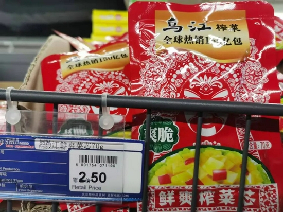 因此,若零售价同比例上涨,即每袋增长0.2元,那么70g的乌江榨菜售价应为2元~2.7元/袋。不过,一家便利店的店主在接受《红周刊》记者采访时表示,“我们没有涨价,一是因为拿货的价格变化不大;二是怕涨价了没人买。我们这边有乌江、鱼泉、红山等品牌的榨菜在售,鱼泉和红山是1.5元/袋,其中,鱼泉销量最好。”