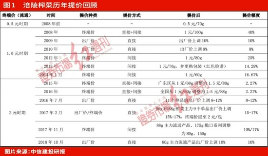 最近的提价难,是涪陵榨菜产品涨价历史上很少见的情况。据中信建投研报显示,涪陵榨菜自2008年至2018年累计共直接或间接提价共12次(见图1,其中2010年11月23日上市),其70g/袋的乌江榨菜已由2008年最初的终端价格0.5元上升至如今2元~2.5元。