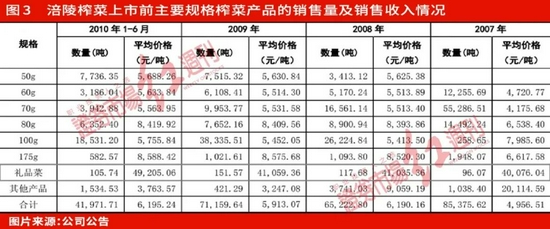 此外,涪陵榨菜也曾想进军高端市场,近期热议的天价榨菜(一盒2000元以上)就是其中的典型。但据悉,天价榨菜的主角是“五年沉香”,涪陵榨菜在2009年就申请了外观设计专利,并在2009年实现了“高光时刻”。据涪陵榨菜招股说明书显示,公司在2007年~2008年分别销售礼品菜96.07吨、117.68吨和151.57吨。其中,2009年的平均售价最高为41059.36元/吨(见图3)。也就是说,涪陵榨菜在2009年销售礼品菜收入约有622.34万元,尽管这个收入在公司的总收入中几乎可以忽略不计。