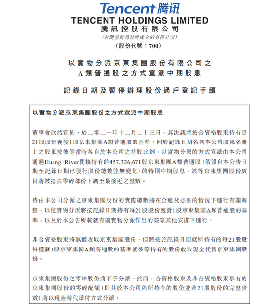 12月23日消息,腾讯控股:董事会欣然宣布,于二零二一年十二月二十三日,其决议将按合资格股东持有每21股股份获发1股京东集团A类普通股的基准,向于记录日期名列本公司股东名册上之股东按彼等当时各自于本公司之持股比例,以实物分派的方式宣派由本公司通过Huang River间接持有的457326671股京东集团A类普通股(假设自本公告日期至记录日期已发行股份总数并无变化)的特别中期股息,该等京东集团股份数目将被捨去零碎部份下调至最接近之整数。