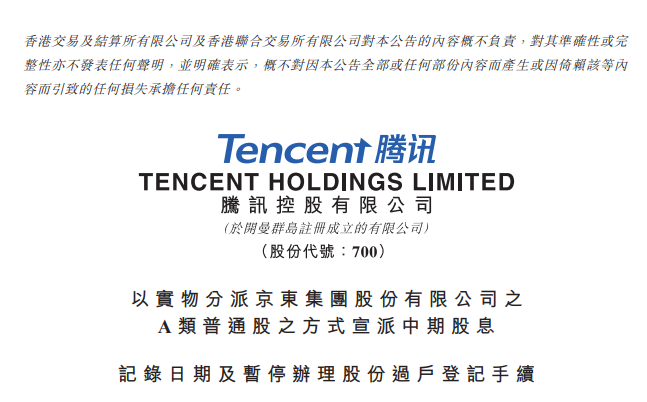 腾讯控股:将以实物分派京东集团A类普通股的方式派发中期股息