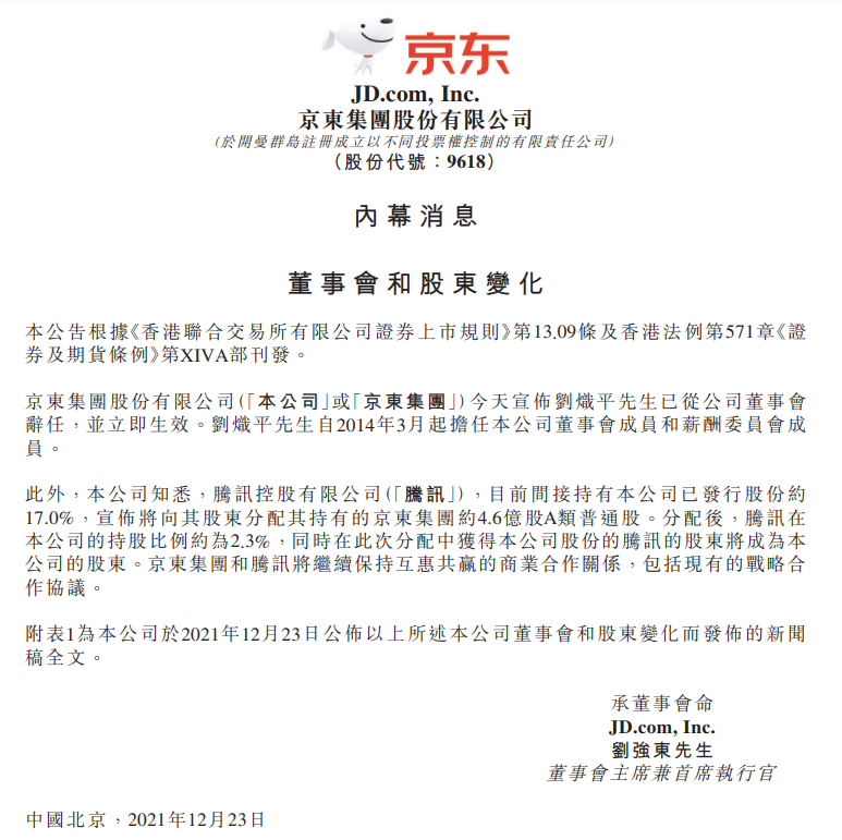 京东集团在公告中表示,刘炽平已从公司董事会辞任,并立即生效。公司知悉,腾讯控股有限公司目前间接持有本公司已发行股份约17.0%,宣布将向其股东分配其持有的京东集团约4.6亿股A类普通股。分配后,腾讯在本公司的持股比例约为2.3%,同时在此次分配中获得本公司股份的腾讯的股东将成为本公司的股东。