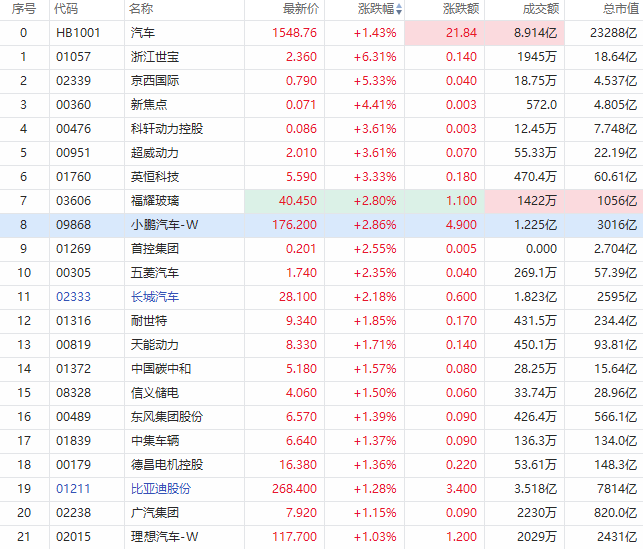 华盛资讯12月23日消息,今日早盘港股汽车股普涨。截至发稿,小鹏汽车涨2.86%,报176.2港元每股,成交额1.225亿港元;五菱汽车、长城汽车涨逾2%;比亚迪涨1.28%,报268.4港元每股,成交额3.518亿港元;广汽集团、理想汽车跟涨。