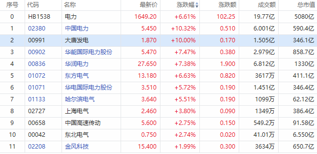 华盛资讯12月23日消息,港股电力股午后集体走高。截至发稿,中国电力涨10.32%,报5.45港元每股,成交额6亿港元;大唐发电涨10%,华电国际电力股份涨超7.47%,华润电力涨7.38%,东方电气涨6.63%;上海电气、金风科技跟涨。